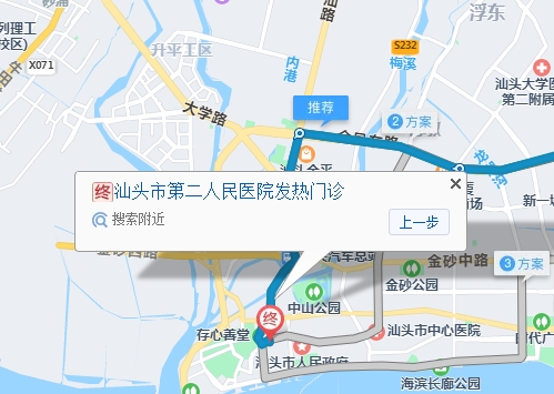汕頭汽車客運(yùn)中心站70米向東步行 到 客運(yùn)中心站19站乘 2路 (汕頭開(kāi)埠文化館方向) 或 12路 到 市總工會(huì)240米向東北步行 到 汕頭市第二人民醫(yī)院發(fā)熱門診汕頭市第二人民醫(yī)院發(fā)熱門診
