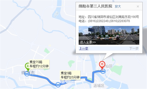 3路三醫(yī)院站下車步行 90米71路→35路1小時3分鐘9.6公里步行480米綿陽市步行 390米火炬大廈(火炬北路)站上車71路七星樓站下車七星樓站 上車35路三醫(yī)院站下車步行 90米