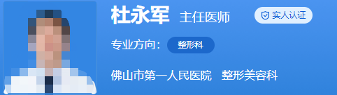 醫(yī)生介紹:杜永軍是主任醫(yī)師,1993年畢業(yè)于中山醫(yī)科大學(xué),一直在整形行業(yè)工作,臨床技術(shù)十分的不錯。還在知名的刊物上發(fā)表了多篇論文,多次獲得佛山科技論文獎。還是廣東省醫(yī)師協(xié)會整形美容外科分會常委委員、中國整形協(xié)會內(nèi)鏡分會委員等。